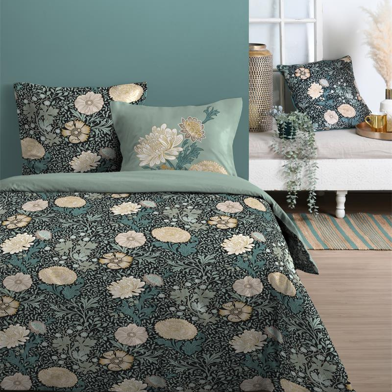 Parure de lit 2 personnes en coton - motif floral vert et beige - 240 X 220 ou 260 X 240 cm