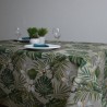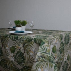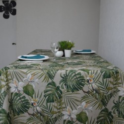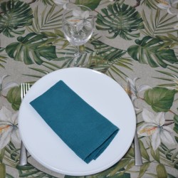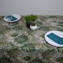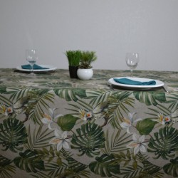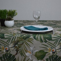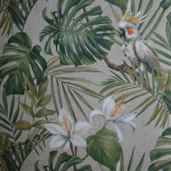 Tissu enduit au mètre Mareva, un esprit "Jungle" avec de larges feuilles, des fleurs tropicales et des perroquets blancs